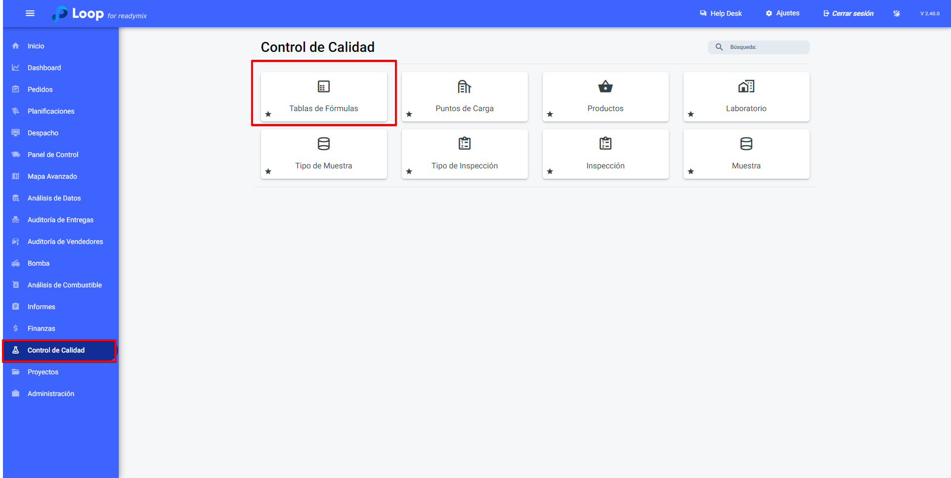 Abre el menú en el lado izquierdo de la pantalla y selecciona 'Control de Calidad' > 'Tabla de Fórmulas'.