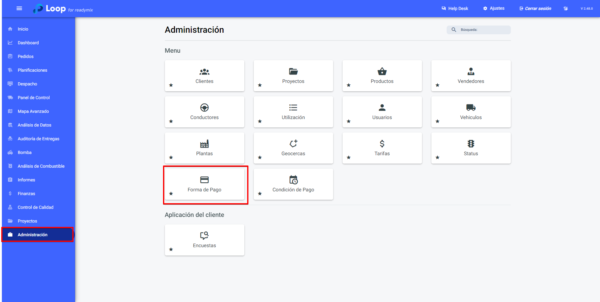 Abra el menú de la izquierda de la pantalla y seleccione "Administración" > "Forma de Pago".